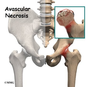A necrose avascular (ou osteonecrose) é a morte do tecido ósseo por falta de suprimento sanguíneo, a mesma lógica que acontece no infarto do coração, porém em alguma parte do osso. Costuma-se pensar que o osso é um feito de cálcio e mais nada, porém o osso é um tecido vivo, com metabolismo ativo e em constante remodelamento. Quando ocorre a morte de parte do osso, ás celulas ativas morrem e a matriz mineralizada com cálcio permanece. Porém o restante, apesar de calcificado, não tem a resistência mecânica para aguentar a carga cíclica que passa pelo quadril por muito tempo, e com o tempo acontece a fratura subcondral e posteriormente o colapso da cabeça femoral, com perda da esfericidade e achatamento. O final disso tudo, é a artrose de quadril e dor decorrente desta.